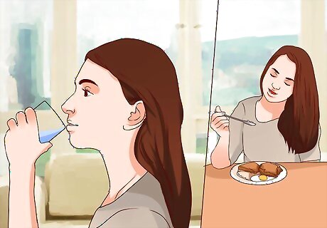 Drink water before each meal. Another trick to help fill you up and keep you satisfied a little longer is by drinking water before each meal. It's also important to drink adequate amounts of fluids all day long. Studies have shown that if you drink a glass of water, about 8 oz (230 ml), right before a meal, this can help trick your brain into feeling more satisfied and stay this way longer. It's also important to drink water throughout the entire day. Many times we feel hungry when in fact we're only thirsty. Aim to drink at least 64 oz (about 2 liters) or about eight glasses of water or other calorie-free, hydrating beverages daily. You may even need up to 13 glasses! Stick to fluids like: water, flavored water, sparkling water or decaf coffee and tea.