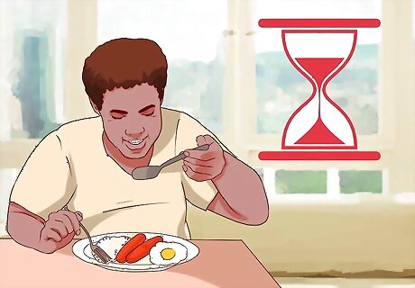 Eat slowly. Before you even start a meal, one way to make you feel more satisfied and stay satisfied may be by regulating the speed at which you eat. Some studies show that slower you eat, the more satisfied you'll feel. It's recommended to take about 20 – 30 minutes to eat each meal. This slow pace may help your brain register being satisfied with your meal. In addition, it helps force you to pay attention to what you are eating and get more mental pleasure from it. Time yourself at each meal for a couple days to get an understanding of how long you normally eat, and let that motivate you to slow down in the future. Try taking a sip of water between bites, putting your fork down in between bites, and talking to others to slow yourself down.