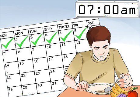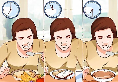 Always eat three meals daily. Like skipping breakfast, if you skip other meals throughout the day or wait several hours between meals, you'll definitely feel more hungry and less satisfied throughout the day. You need to eat regular meals every four to five hours. This helps maintain blood sugar levels, appetite and your desire to eat. Make a meal plan or list of meals and snacks to have daily to help keep you to this schedule. If you skip meals you might feeling hungrier throughout the day which may lead to overeating at your next meal or snack time.