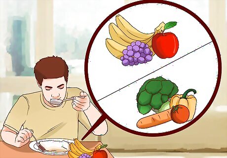 Bulk up your meals with two to three servings of a fruit or vegetable. Fruits and vegetables are great food groups to add bulk to your meals to help keep you feeling satisfied longer throughout the day. USDA recommends that adult women and men eat 2 cups of fruit each day and 2.5 – 3 cups of vegetables each day. Both fruits and vegetables are known to increase satiation or satisfaction for a few reasons. They're high in fiber, water, and air content. Fiber and high water content help add physical bulk to your meals (without too many calories) and air can help you feel more physically full. Studies have shown that higher fiber diets help you feel more satisfied for longer. Bulking up meals with fruits and vegetables is an easy way to get your 25-38 g of fiber (the recommendations for women and men respectively) each day. Include at least two to three servings of fruits and vegetables at each meal, or try to make half your plate half fruits or vegetables. Measure out 1 cup of vegetables, 2 cups of leafy greens or about 1/2 cup of fruit per serving.