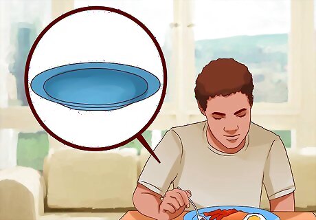 Eat off a blue plate. Another interesting way to trick your brain into eating less and feeling more satisfied is by eating off blue plates. Studies have shown that when people eat off of blue plates, they tend to eat less. In addition, since blue isn't found in natural foods, we have a reduce appetite in response to seeing this color. In addition, try eating off of smaller plates. This will limit how much food you can serve yourself at one sitting and may help you eat less.