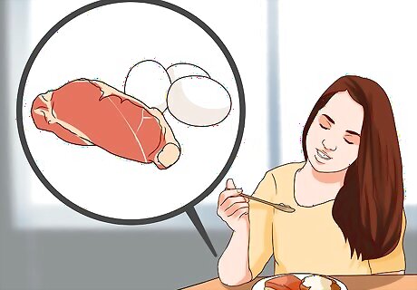 Include lean protein at each meal. Protein is an essential nutrient to your diet. It not only helps fuel your metabolism, but can also help you feel more satisfied with your meals. A higher protein diet has been shown in many studies, to be helpful in managing hunger and increasing your overall satiation after your meal. It can take 15 to 20 minutes after food is eaten for the satiety signals to reach the brain. Foods high in protein seem to register satiety faster than carbohydrates and fat. Aim for at least one serving of protein at most meals. One serving is about 3 – 4 oz or about the size of your palm. Try using a food scale to help keep you on track if needed. There are many different sources of protein. Try to stick to leaner protein as this is lower in calories. Even if you're not trying to lose weight, eating larger quantities of higher fat protein can cause weight gain due to a higher calorie level. Proteins to try include: beans and pulses, poultry, eggs, lean beef, fish, low-fat dairy products and tofu.