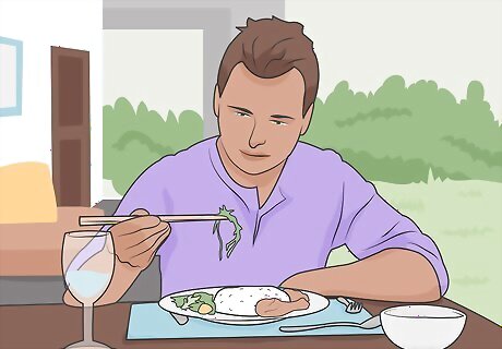 Eat slowly to avoid overeating. Being too full can trigger heartburn because it could force acids back into your esophagus. Consciously try to eat slowly and stop when you’re starting to get full. A common trick for making yourself eat slower is counting the number of times you chew each bite. If you have trouble eating slowly, try chewing each bite 20 times before taking another. If you’re at a restaurant, take your meal to go if you’re getting too full.
