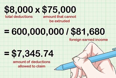 Adjust deductions based on your income exclusions. While you are allowed the same deductions as U.S. citizens living in the U.S., you cannot take those deductions to the extent that they were paid for with income you excluded. For example, suppose you had $75,000 in foreign earned income and $8,000 in allowable deductions. If you excluded all of your foreign earned income, you would not be able to take any deductions that year. If you were only able to exclude a portion of your foreign earned income, multiply your total deductions by the amount of income you can't exclude, then divide by your total foreign earned income. This is the amount of deductions you're allowed to claim.