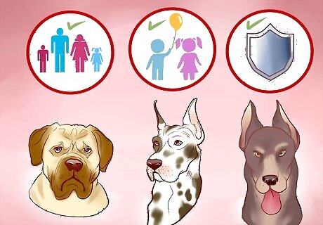 Research different breeds. Some breeds were produced for their ability to guard homes. These breeds are highly trainable, loyal, alert, and energetic. Both large and small breeds can function as guard dogs, depending on your needs. Look for a breed that is adapted for your specific purpose. Rottweilers are good for protecting homes and property. Mastiffs are good at protecting families. Great Danes are great with children. Their large size makes them menacing to strangers, but they are not an aggressive breed. They are also effective watchdogs. Great Pyrenees can guard livestock. Doberman Pinschers, bull terriers, pulis, and Rhodesian Ridgebacks also make good guard dogs. Mixed dogs can also be effective guard dogs too. While you may not be able to identify their temperament from their breed, you can still evaluate them for good guard dog characteristics.