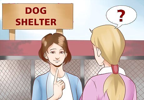 Visit dog shelters and rescue organizations. You do not necessarily need a purebred puppy to have a good guard dog. You may be able to find one at a shelter or rescue organization instead. Visit various shelters in your area to see if they have a suitable dog. When you visit, let the volunteers or workers know that you want a guard dog. Ask them if they know of any good candidates. Some rescue organizations are breed specific. This means that you may be able to adopt a purebred rescue at a much lower cost than buying a puppy from a breeder.