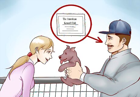 Contact breeders. Many good guard dogs are brought up within the family from a young age. This allows them to bond with their families so that they can protect them later in life. If you have identified a specific breed that you want, see if there are any local breeders. Contact them, and ask if they will have any litters of puppies available for adoption soon. Puppies bought at puppy stores are often sourced from puppy mills. You should look for a responsible breeder who has certifications and recommendations from a recognized kennel club.