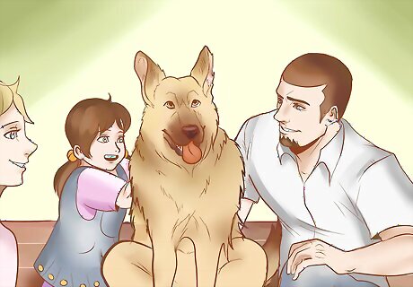Introduce the dog to the entire family. A guard dog should be able to socialize, bond, and protect the entire family. As soon as the dog enters the house, introduce them on a leash to each person living in the home. Encourage all family members to pet and interact with the dog. This will let them start to bond with their family, and it can foster loyalty to the family soon after their arrival.
