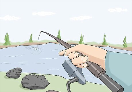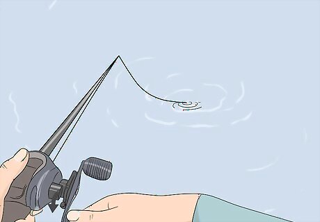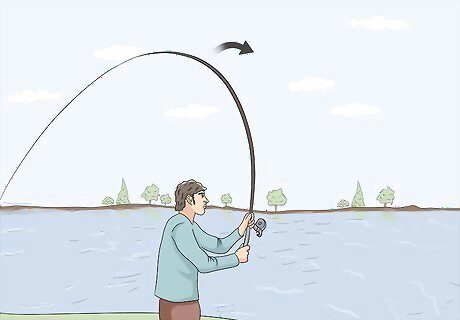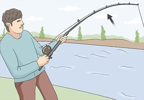 Jerk the rod upwards when you feel a bite to set the hook. Whenever you feel a nibble or a small jerk of your fishing rod, sharply raise it upwards to cause the hook to pierce the mouth of the fish. This will set the hook and make it impossible for the fish to spit the lure out of its mouth. Only set the hook once! If you snap or jerk the rod repeatedly, you could rip the hook out of the mouth of the fish.