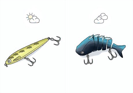 Pick bright colors for sunny days and dark ones for cloudy days. Carry lighter white and yellow colored poppers to use when you’re fishing in bright and sunny conditions so the fish can see the popper on the water. Use darker colors like black and purple for overcast days and low-light conditions, such as in the early morning hours or at dusk so the fish can see it bobbing on the water as well.