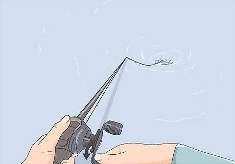 Bring the fish in toward you by reeling it in steadily. After you set the hook and snag a fish, it will continue to fight until it tires itself out. Don’t try to reel the fish in as fast as you can or you could potentially pop your line or rip the hook from its mouth. Instead, reel at a slow and steady pace and let the fish tire itself out by not allowing too much tension to build up in the line. When the fish is near you or the edge of your boat, pull it out of the water and place it into a net. Wear safety gloves when you pull the hook from the fish’s mouth so you don’t accidentally stab yourself.