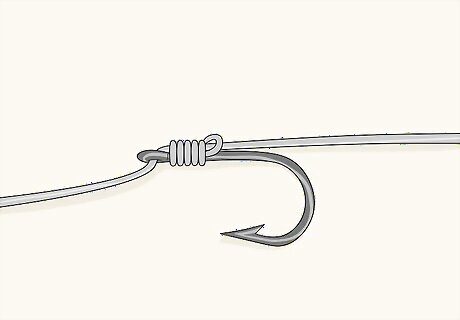 Tie a basic loop knot to secure the popper to your line. Slip the end of the line through the eye, or metal loop, in the mouth of the popper. Push about 8 inches (20 cm) of slack through the eye so you can form your knot. Hold the eye with your index finger and thumb and loop the line around your index finger, then back over itself, and keep your finger inside the loop. Then, wrap the line around itself about 5 times, thread the end of it through the loop, and pull it tight. Trim off any excess line with a pair of scissors or a knife. Rig your fishing line so the popper is held securely and won’t come off when a fish bites it. A loop knot is a simple way to firmly secure the popper to your line.