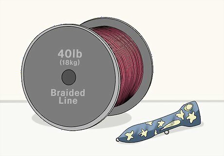 Choose 40 lb (18 kg) braided line when you’re rigging a popper. Pair a popper lure with a braided line that is both strong and difficult for fish to see in the water. Choose a braided line that is between a 30–40 pounds (14–18 kg) test so you can be sure it won’t break when a fish takes your bait. Spool braided fishing line onto your reel or use a reel that already has braided line on it to rig up your popper lure.Variation: If you don’t have braided fishing line, use a monofilament line that is rated between 17–20 pounds (7.7–9.1 kg) test, which means it can withstand that much force before it breaks.