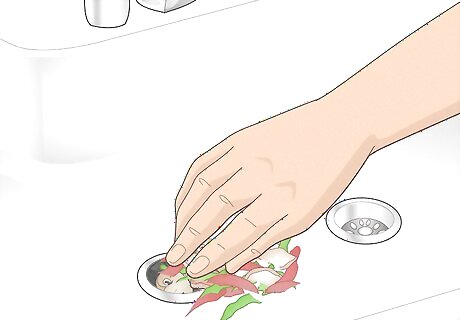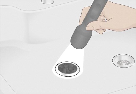 Look down through the sink drain for any blockages. Get a flashlight and shine it into the sink drain and garbage disposal. Shine the light over the unit’s outer edge, since this is where blockages typically happen. Find the small teeth of the disposal’s blades on the outer edge and look for anything obstructing them.