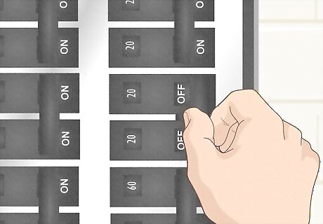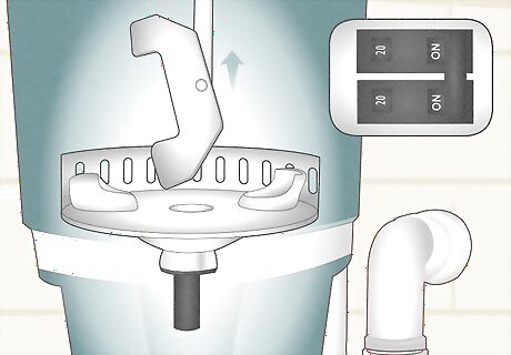 Turn off the room’s electrical supply. To turn off the electricity, go to the fuse box in your home. It is usually on the bottom floor or in the basement. Find the switch that corresponds to the room with the disposal unit and flip the switch to off. The switches should be labeled, but you can test the room for an electrical current by plugging something into a wall outlet and attempting to turn it on. Another way to do this is to flip the light switch near the disposal unit. This only works if the switch controls the electrical outlet the unit is plugged into. Check by listening to the unit for humming.
