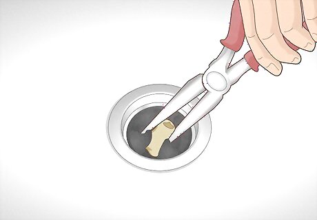 Remove blockages with tongs or pliers. For safety, avoid sticking your hand into the disposal unit. Instead, get a pair of kitchen tongs or pliers from your toolbox. Stick them down through the sink and into the disposal unit. Use them to break away any blockages you notice.