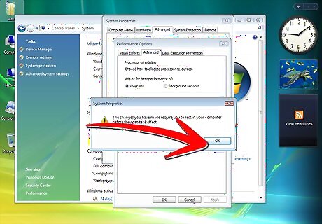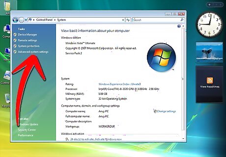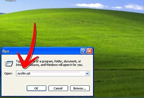 Click the "Start" button. Click "Run." Type "sysdm.cpl" in the box labeled "Open" and then click "OK."