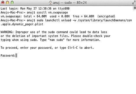 To turn off the swap file, type this command into the Terminal window: sudo launchctl unload -w /System/Library/LaunchDaemons/com.apple.dynamic_pager.plist