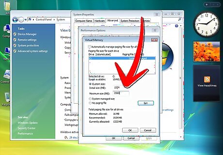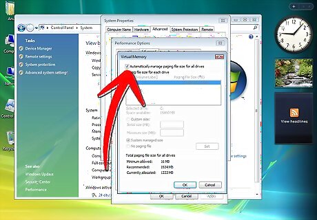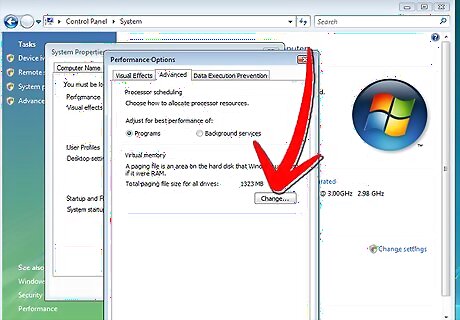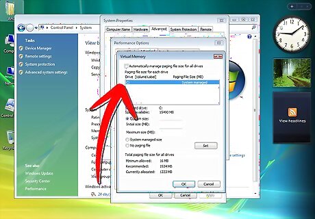 Press the "Advanced" tab. Find the "Virtual Memory" heading the click "Change."