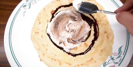Place your crepe on a plate and cover it with filling. To start folding your crepe, lift it from the pan with a rubber spatula and place it on a wide plate to cool for 2-3 minutes. Spread your filling over the crepe in a thin layer, using a spoon or ladle, and even it out with a knife. Leave about 2–3 in (5.1–7.6 cm) of space around the edges. Fillings to Try: Sweet: Butter and sugar or lemon juice Nutella Fresh fruit and powdered sugar Whipped cream and chocolate sauce Savory: Ham or cooked asparagus and cheese Bacon and eggs Smoked fish and potatoes