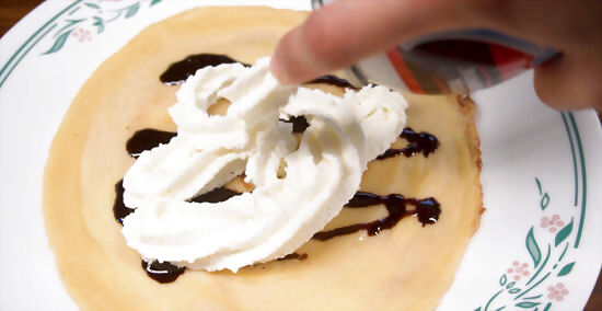 Eat the crepe on a plate or take it to-go. The rolled crepe method allows you to eat on the go or at home! You can use utensils to cut into it on a plate, or simply wrap it in deli paper and eat it with your hands. If you eat the crepe on a plate, feel free to add extra toppings like sliced nuts and whipped cream for a sweet treat, or cooked vegetables if your crepe is savory.