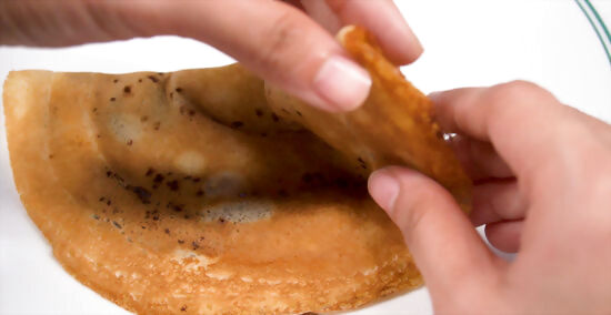 Fold the crepe in half. Using your hands or a flat rubber spatula, lift one side of the crepe and fold it carefully over the other, covering the filling. Try to make the edges match up as evenly as possible. You should end up with a semicircle on one side of the plate.