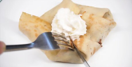 Serve your crepe on a plate or wrapped in paper. If you’re taking your crepe to go, wrap it in a sheet of deli paper so that the curved top edge sticks out the top. If you’re eating at home, simply lift the crepe onto a plate and enjoy! You can serve the crepe with fruit or whipped cream if it’s sweet, or veggies or potatoes if it’s savory.
