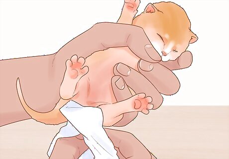 Help the kittens defecate and urinate right after feeding. If the kittens you are fostering are very young, you may need to help their digestive system develop. After each feeding, wet a cotton ball with warm water and gently massage the kitten's rectum until it defecates. To help the kitten urinate, rub the cotton ball over its genitals. This is crucial for the kitten's developing digestive processes. This process replicates what the mother would usually do with her tongue.