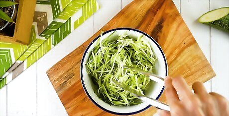 Scoop the zucchini out and set it in the middle of a clean cloth. Spread a clean fabric cloth out on your table or countertop. Use a slotted spoon to scoop the zucchini out into the center of the cloth. While scooping, do your best to avoid scooping up large amounts of zucchini juice from the bottom of the bowl. Continue scooping until you remove all of the zucchini.Warning: Do not use a cloth prone to shedding fibers for this. You don’t want random pieces of cloth showing up in you zucchini dishes! You can use tongs instead of a slotted spoon if you prefer. A small tablecloth or fabric place setting works well for this if you don’t have a good cloth nearby. If you’re shredding zucchini specifically to freeze it, you can shred the zucchini directly over the cloth to make things easy.