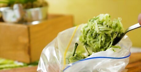 Transfer your shredded zucchini to airtight plastic food storage bags. Wash your hands to remove the zucchini residue. Then, untwist the cloth to expose the shredded zucchini. Grab enough airtight food storage bags to store all of your shredded zucchini. Open the bags and use a spoon to scoop your zucchini into the bags.Tip: Don’t overstuff your bags. It’s better to use a large number of thinly-packed bags than a small number of heavily-stuffed bags. You can use freezer bags if you’d like, but standard food storage bags will work just fine. You should not use hard plastic containers however. The more air in the package, the more likely your zucchini is to go bad. Label each of your bags with the contents and the date so that you don’t mix your zucchini up with other items in your fridge.