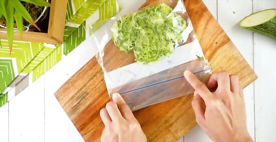 Twist the towel up and squeeze the zucchini to remove the juice. Take the 4 corners of the cloth and raise them together over the zucchini to make a sack. Hold the cloth over your sink or bowl and twist the sack of zucchini in either direction. Continue turning the cloth in the same direction until the sack of zucchini becomes taut. Then, gently squeeze the sack of zucchini by hand. Continue doing this until juices stop dripping out of the sack. It is nearly impossible to get rid of all the moisture and juices. The goal is simply to get rid of most of the liquid so that the small amount of remaining fluids don’t ruin your zucchini when it thaws.