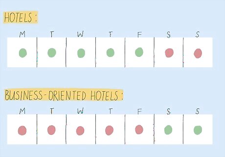 Stay at the hotel during the week instead of on weekends. Peak times for many hotels are during holidays and weekends, and many rooms might already be booked. If you can, choose to stay at hotels during weeknights since they’ll have more rooms available for you. Check the prices of rooms on different nights of the week to find out when they’re the busiest. Rooms will usually be more expensive when the hotel is busy and cheaper when there aren’t as many guests. If a hotel is more business-oriented, they may be less busy and cheaper during the weekend instead of during the week. You’re more likely to get a room upgrade if you only stay at the hotel for 1-2 nights.