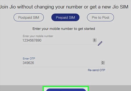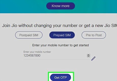 Enter your phone number and click Get OTP. Use a phone number on which you can receive text messages. Jio will text you a one-time password (OTP) that you'll need to enter to continue.