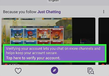 Tap the purple Tap here to verify your account banner. This banner shows up at the bottom of your screen when you open the app. This will send you an automated email message with a verification code, and open the verification page in the Twitch app. If you don't see this purple banner at the bottom of your Following, Discover, and Browse tabs, your email address is already verified.