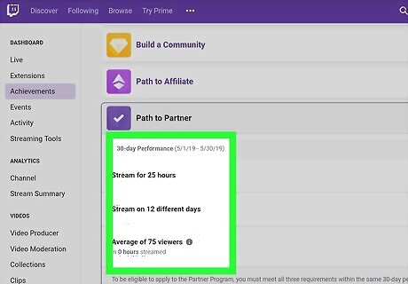 Complete the "Path to Partner" requirements on your stream account. In order to apply for partnership and a "Verified" badge, you must: Reach 50 followers. Stream for 25 hours in the last 30 days. Stream for 12 unique days in the last 30 days Reach 75 average viewers in the last 30 days, excluding Hosts, Raids, and Embeds.