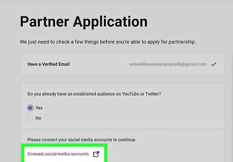 Fill out the Partner Application form in your browser. You will need to enter your streamer username, email address, full name, and a channel description here. Make sure to use the "Description" field effectively, and give specific details that will demonstrate why you would make a good Twitch partner. Optionally, you can enter your YouTube, Twitter, and Facebook accounts on your application. If you have a huge social media presence, it may help you get a partnership deal with a successful application.