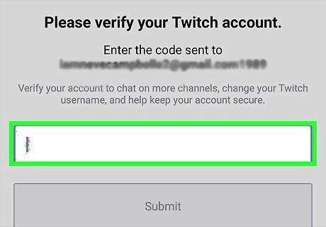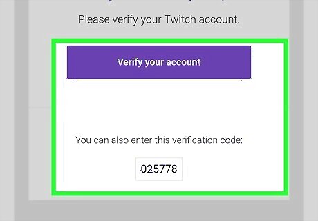 Enter the verification code into the Twitch app. Find your verification code in Twitch's automated email message, and enter it into the text field on the Twitch verification page in the app. Alternatively, you can tap the Verify your account button in the email message.