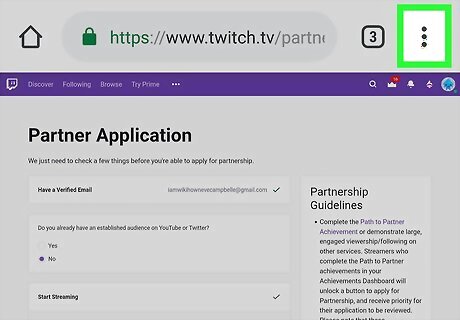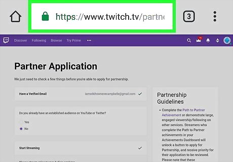 Open the Twitch Partner Signup form in Chrome. Type https://www.twitch.tv/partner/signup into the address bar, and press ↵ Enter or ⏎ Return on your keyboard. If you're not automatically signed in, you'll be prompted to log in now.