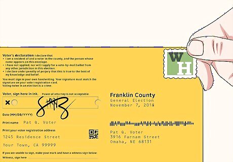 Sign your envelope and affix postage. There is a space on the outside of your envelope for your signature. This signature must match the signature on your voter registration record. Write the date next to your signature. If you're mailing your ballot to the clerk's office, include at least 60 cents' worth of postage. If you are disabled and required assistance to mark your ballot, the person who assisted you must also sign the return envelope in the space provided.