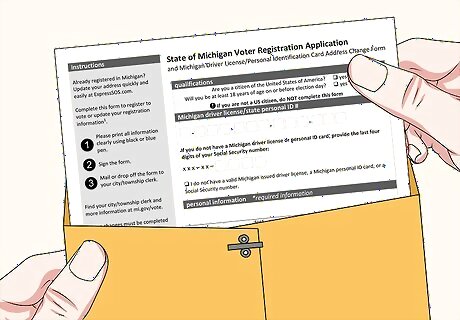 Submit your application to your local clerk's office. You can take your application to the clerk's office in person, or you can mail it in. If you mail it in and you've never voted in Michigan before, you must also include a copy of your driver's license or state-issued photo ID, as well as a photocopy of a paycheck stub, utility bill, or other document to prove your residency. If you hand-deliver your application to the local clerk's office, the clerk can review your original documents. Do not send original documents in the mail. If you have previously registered to vote in Michigan, you do not have to meet this additional identification requirement.