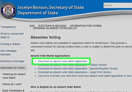 Download the absent voter ballot application. The absent voter ballot application allows you to vote as an absent voter in the next scheduled election. You must complete an application before every election in which you want to vote as an absent voter, including special elections. You can access the absent voter ballot application at https://www.michigan.gov/sos/0,4670,7-127-1633_8716_8728-21037--,00.html. There is a version you can fill out on your computer, a version for you to print and fill out by hand, a version in Spanish, and a large-print version.