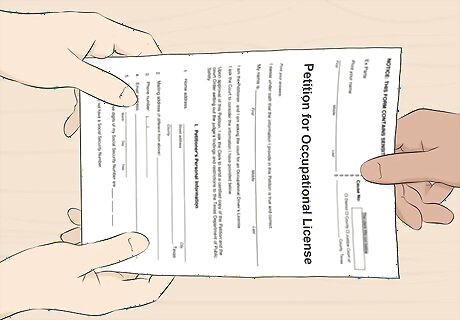 Submit an occupational license petition form. Premade digital forms are usually available through the website of the county or court to which you’re pleading your case. Fill out the form, then take it down to the court or city-county building and present it to a DPS clerk in person. In some counties, it’s also possible to submit your petition online via E-File. Keep in mind that different courts have different requirements about the contents of an occupational license petition. It may therefore be necessary to acquire a special form directly from the court overseeing your case.