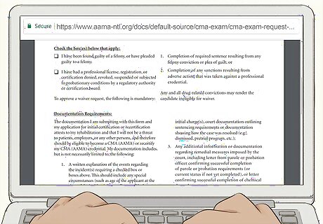 Make sure you don’t have anything on your record that will disqualify you. If you’ve been found guilty or pled guilty to a felony or had a certification revoked, you may be ineligible for certification. You can apply for the Certifying Board to waive these requirements by filling out a form explaining the circumstances, but they may not let you take the exam. Find the waiver form on the American Association of Medical Assistants website: https://www.aama-ntl.org/docs/default-source/cma-exam/cma-exam-request-waiver.pdf?sfvrsn=20