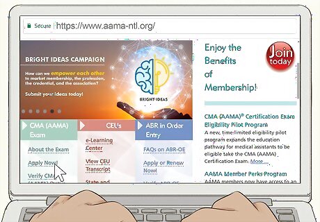 Apply for the American Association of Medical Assistants exam. You can apply online or by mail. Specify the 90-day testing period that you want on the application. The sooner you take the exam, the smaller the exam fee is, and the more you’ll remember from all the classes you’ve taken. You need to take the exam within 5 years of graduating from your program. You are allowed to take the exam 30 days before you finish your program, but your program director will have to verify that you’ve finished before you receive your official scores. If you need special accommodations, submit a form with your application.