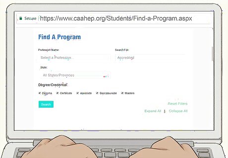 Find an accredited medical assisting program. It should be accredited by the Commission on Accreditation of Allied Health Education Programs (CAAHEP) or the Accrediting Bureau of Health Education Schools (ABHES). Even if you’ve already spent a lot of time working as a medical assistant, you will have to graduate from a program to get certified. Community colleges and technical schools often run medical assisting programs. When you’re searching for a program, check the pass rate to see how many graduates of the program are able to pass the accreditation exam. Use these links to find an accredited program: https://www.caahep.org/students/find-an-accredited-program and https://ams.abhes.org/directory/
