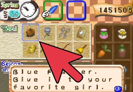 After you have completed these events, their heart levels should be yellow or bordering on pink. If you have completed the events and never missed her birthday, continue to give your lady her favorite gift until her heart turns pink. Once she has reached a pink heart visit the Tool shop, which Rick owns. It is in the upper left corner of the town. You will notice he has a new item. It will appear to be a blue feather. The cost will be 1000 G. Take note you will need to have upgraded your house and buy a kitchen before you can get married. The blue feather will only appear once you have completed this.