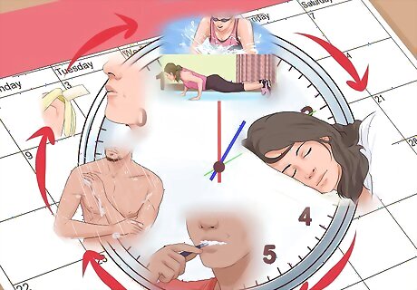 Get into a routine. Routines are important for people trying to cope with, or get rid of depression and anxiety. Having a daily routine which you follow can be a big help. The reason for this is because a routine gives you something to focus on and look forward to. When we are left with no concrete plans we find that it may be easier to wander and procrastinate. Try to get up at the same time every day, eat a healthy breakfast and follow daily routines. These routines can be as simple as brushing your teeth, or more involved like planning out a whole day. You can also incorporate time just for you into your daily routine. Maybe you find it helpful to go for a fifteen-minute walk every day after lunch. If you are on medication, make sure to take it at the same time each day.