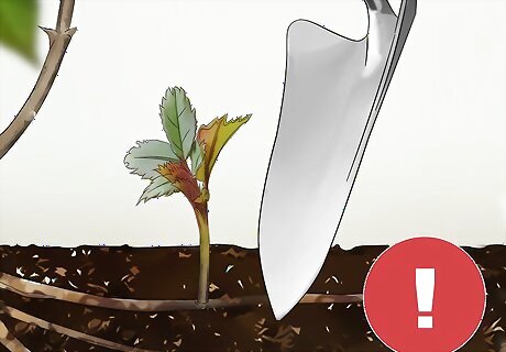 Use caution when digging around your rose bush. One of the most common reasons rose bushes produce suckers is because the roots have been damaged. This usually occurs when someone digs around the rose bush, like when you are weeding. When you are digging around your rose bush for any reason, you should take special care not to injure the roots at all.
