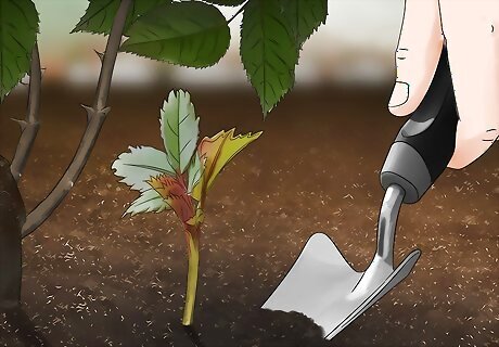 Remove the soil from around the base. To find the source of the sucker, you should get rid of all the soil around the base of the sucker. Expose the roots of the rose bush to find where the sucker is growing from. Use a trowel or your hands to remove the dirt that covers the sucker.
