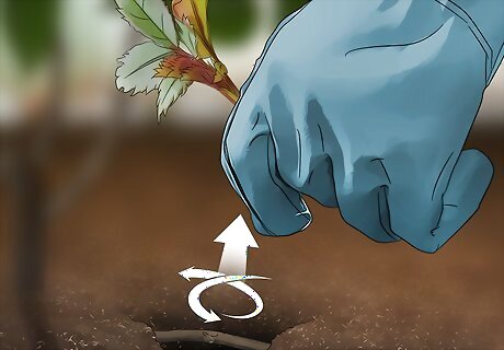 Pull off the sucker. Place thick gloves on your hands to protect them from any thorns. Take the sucker in your hand firmly. Twist the sucker and pull it off. Do this for any buds or sprouts that you see. Only remove the sucker, not the stems of the healthy rose bush.
